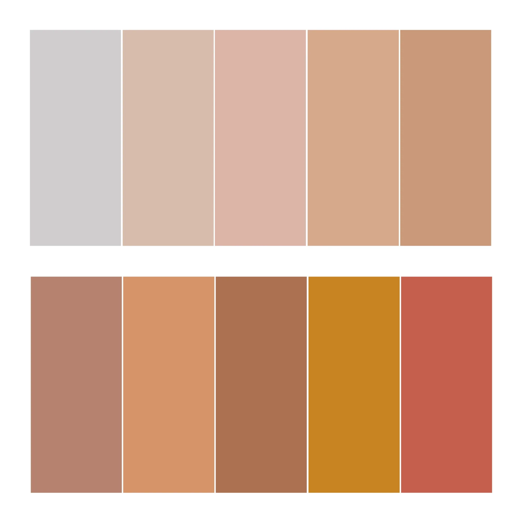 6 bases S/B: 001 Porcelana, 004 Arena, 005 Beige Puro, 006 Toffee, 008 Arcilla, 011 Cacao Oscuro (1/4 oz).